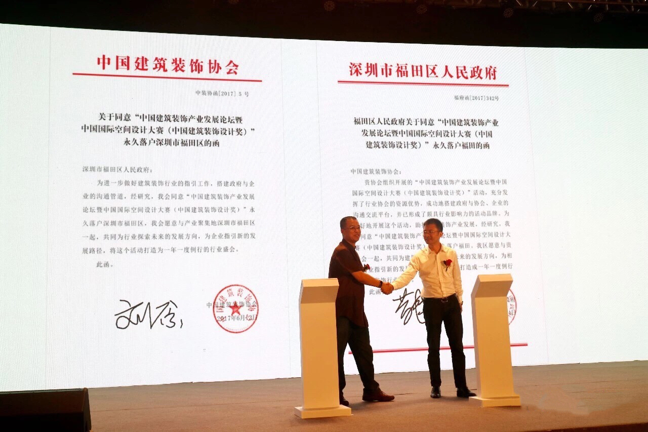 会议还举行了中国国际空间设计大赛永久落户福田签约仪式。中国建筑装饰协会副秘书长刘原,中共福田区委常委、常务副区长黄伟在现场进行了电子签约。